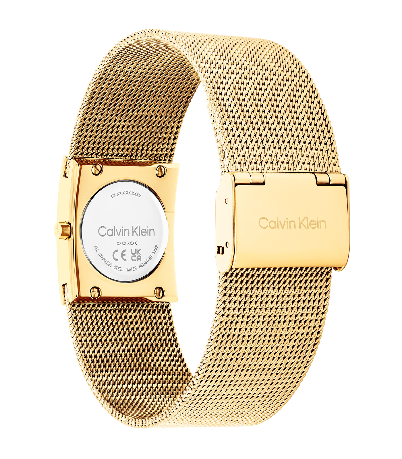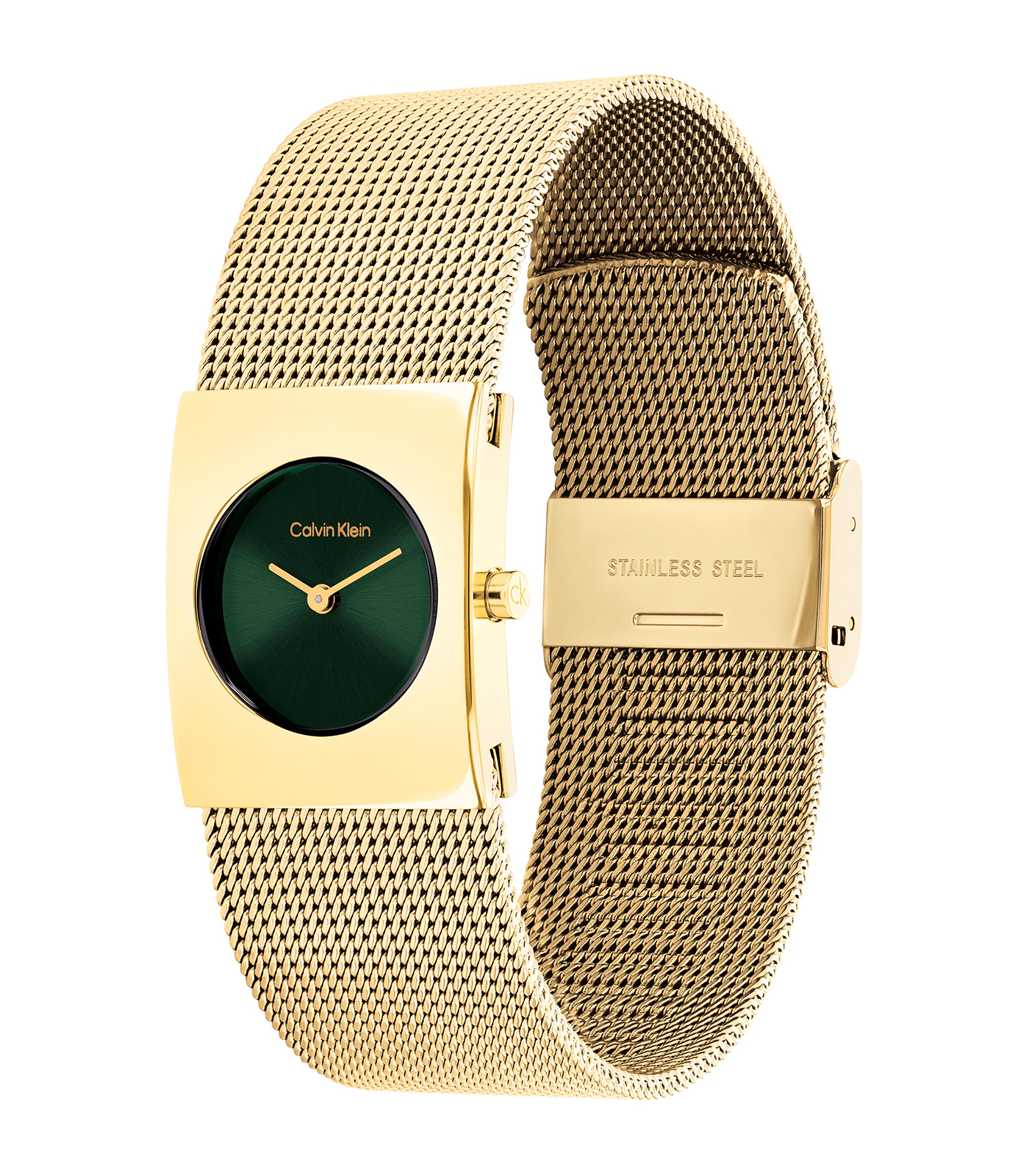 Het Calvin Klein Goudkleurig Dames Horloge (modelnummer 25100136) is een elegant polshorloge met analoge aanduiding. Een goudkleurige kast en band van milanese mesh. De groene wijzerplaat en rechthoekige kast geven een stijlvolle uitstraling. Perfect te dragen bij formele en casual gelegenheden.