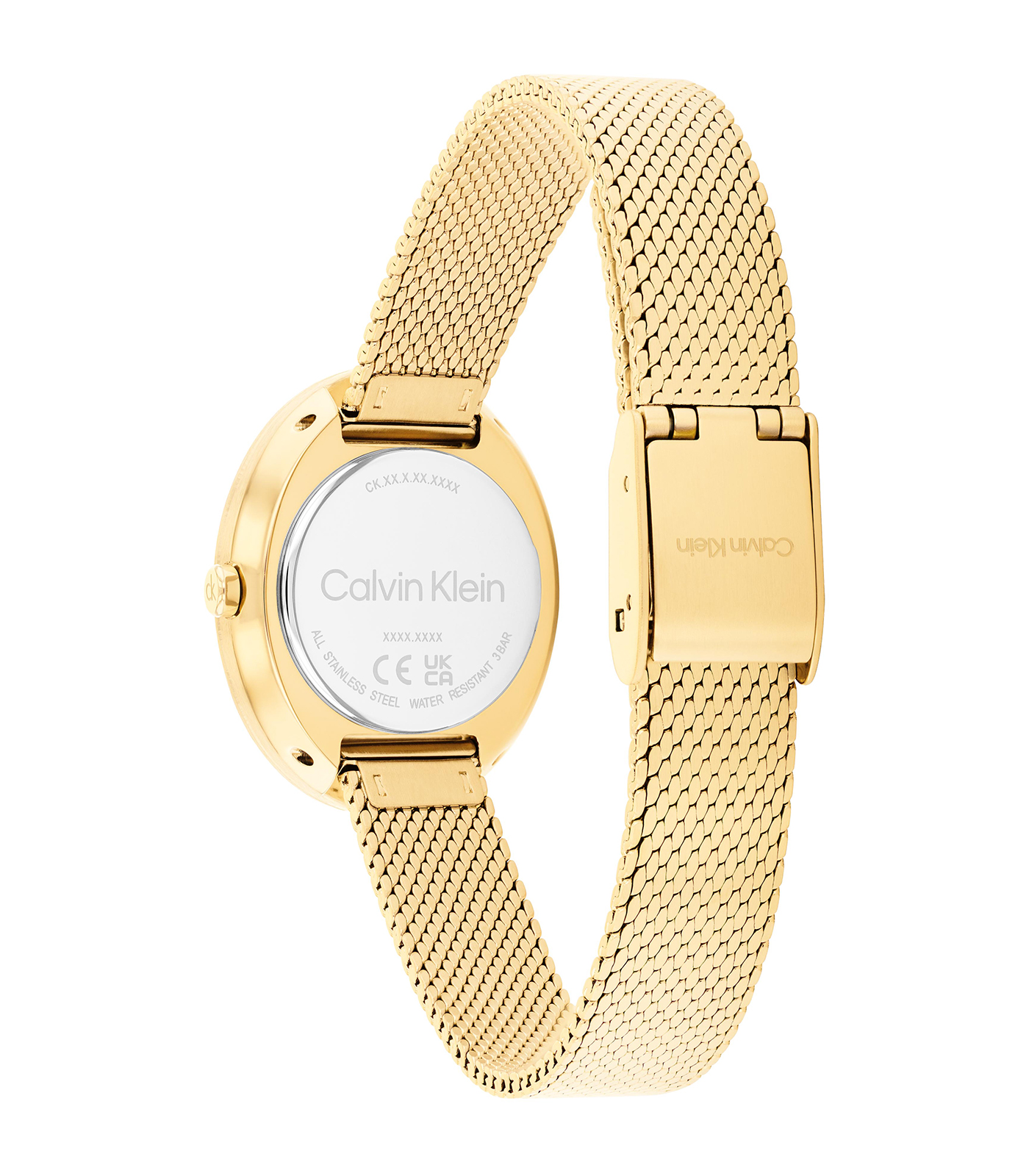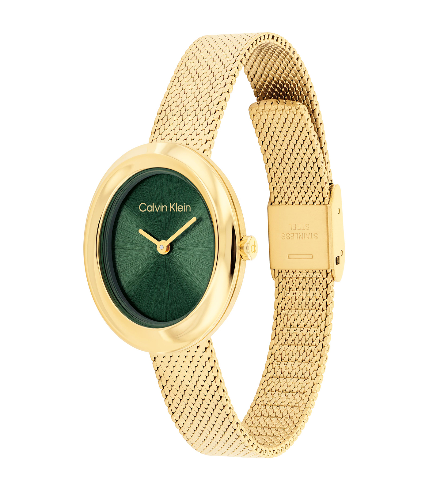 Het Calvin Klein dameshorloge model 25100152 beschikt over een roestvrijstalen kast en Milanese mesh band, beide goudkleurig. Met een groene wijzerplaat en analoog quartz uurwerk, is dit horloge waterbestendig tot niveau 3. Ideaal voor een chique, alledaagse stijl. Draag het bij elegante of casual outfits voor een verfijnde touch.