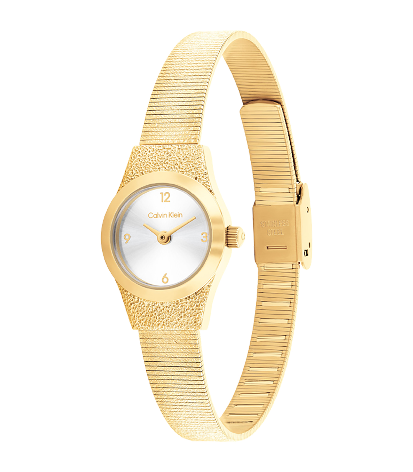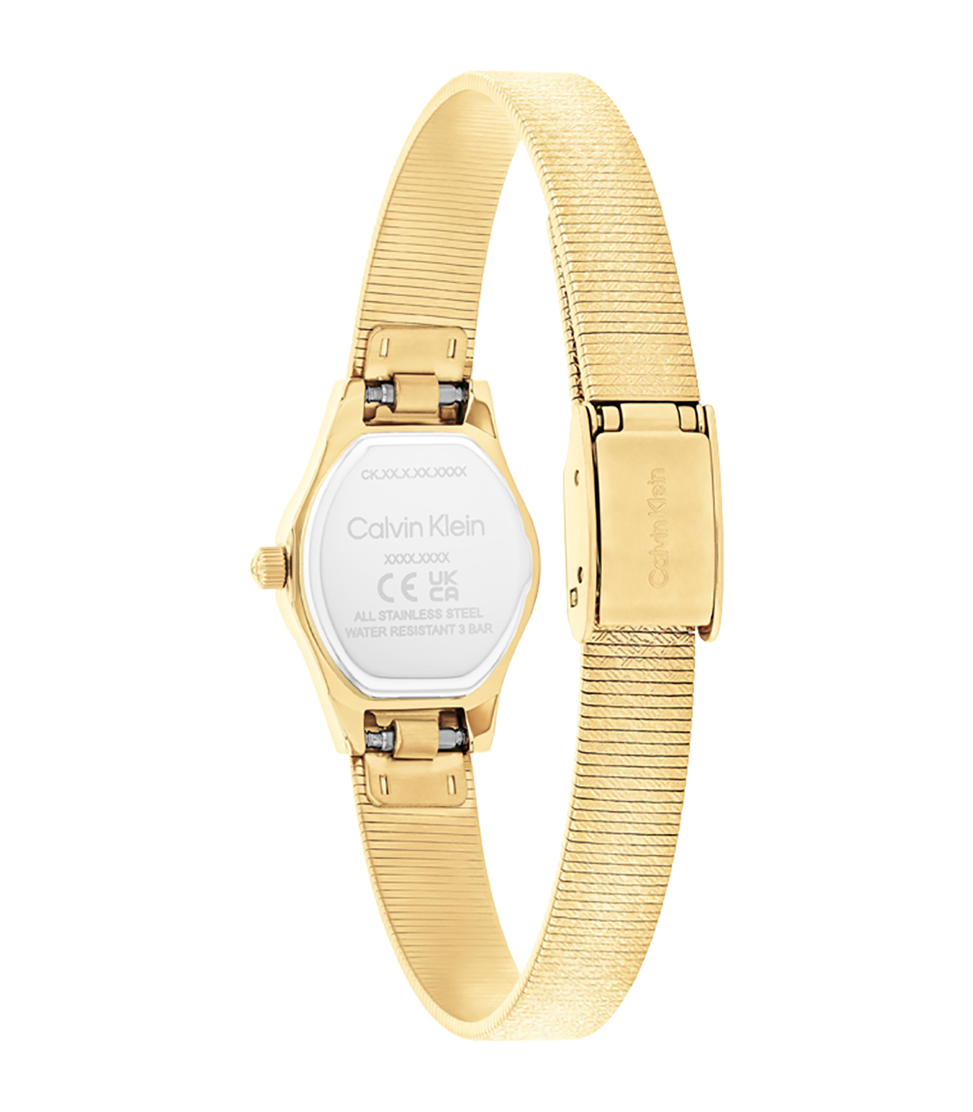 Dit Calvin Klein Goudkleurige Dameshorloge heeft een elegant, rond ontwerp met een roestvrijstalen kast en Milanese mesh band, beide in goudkleur. Het heeft een witte wijzerplaat met Arabische indexen. Waterbestendig niveau 3, nikkelvrij en voorzien van een quartz bewegingsmechanisme. Ideaal om dagelijks te dragen voor een stijlvolle, klassieke look.