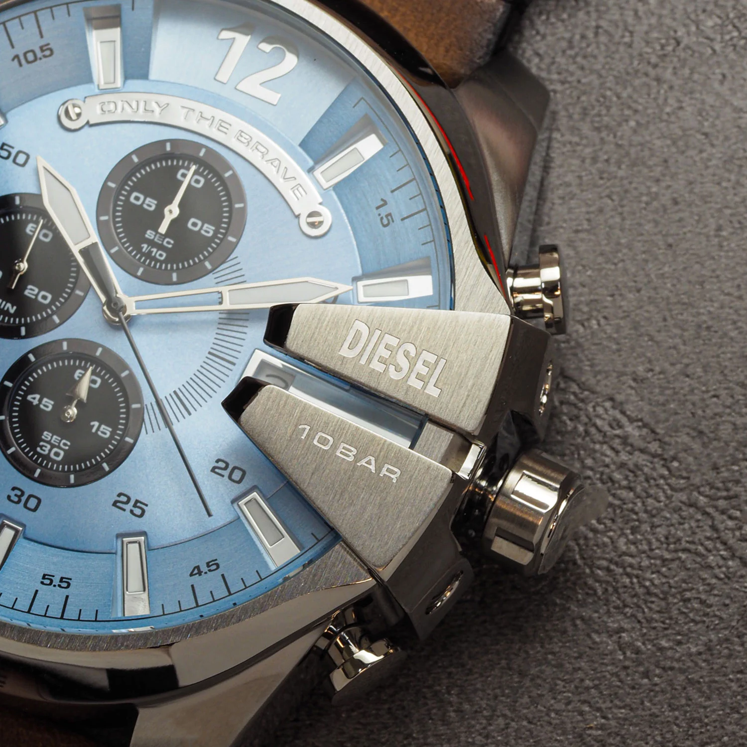 Dit Diesel Mega Chief Heren Horloge, model DZ4657, beschikt over een roestvrijstalen kast met een blauw wijzerplaat en bruine leren band. Het heeft een analoge kwartsbewegingsmechanisme, datumfunctie en is waterbestendig tot 10 ATM. Het is nikkelvrij en ideaal voor dagelijks gebruik of bij zakelijke en casual outfits. Perfect te combineren met koele of neutrale tinten.