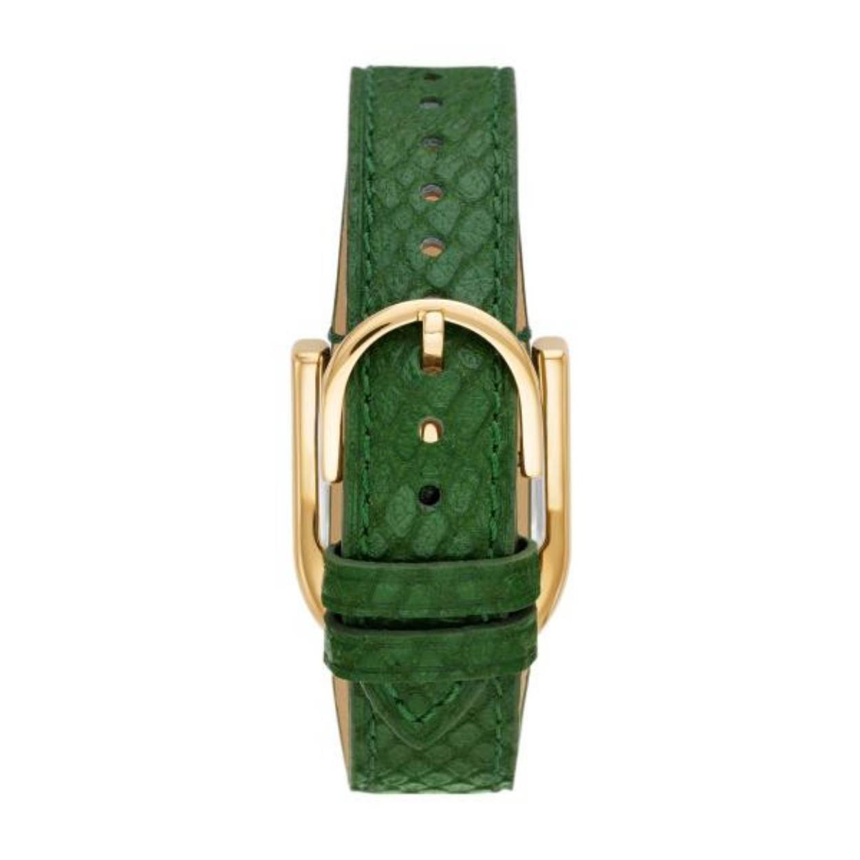 Fossil dames horloge uit de collectie Harwell. Het horloge is goudkleurig met een groene lerenband.