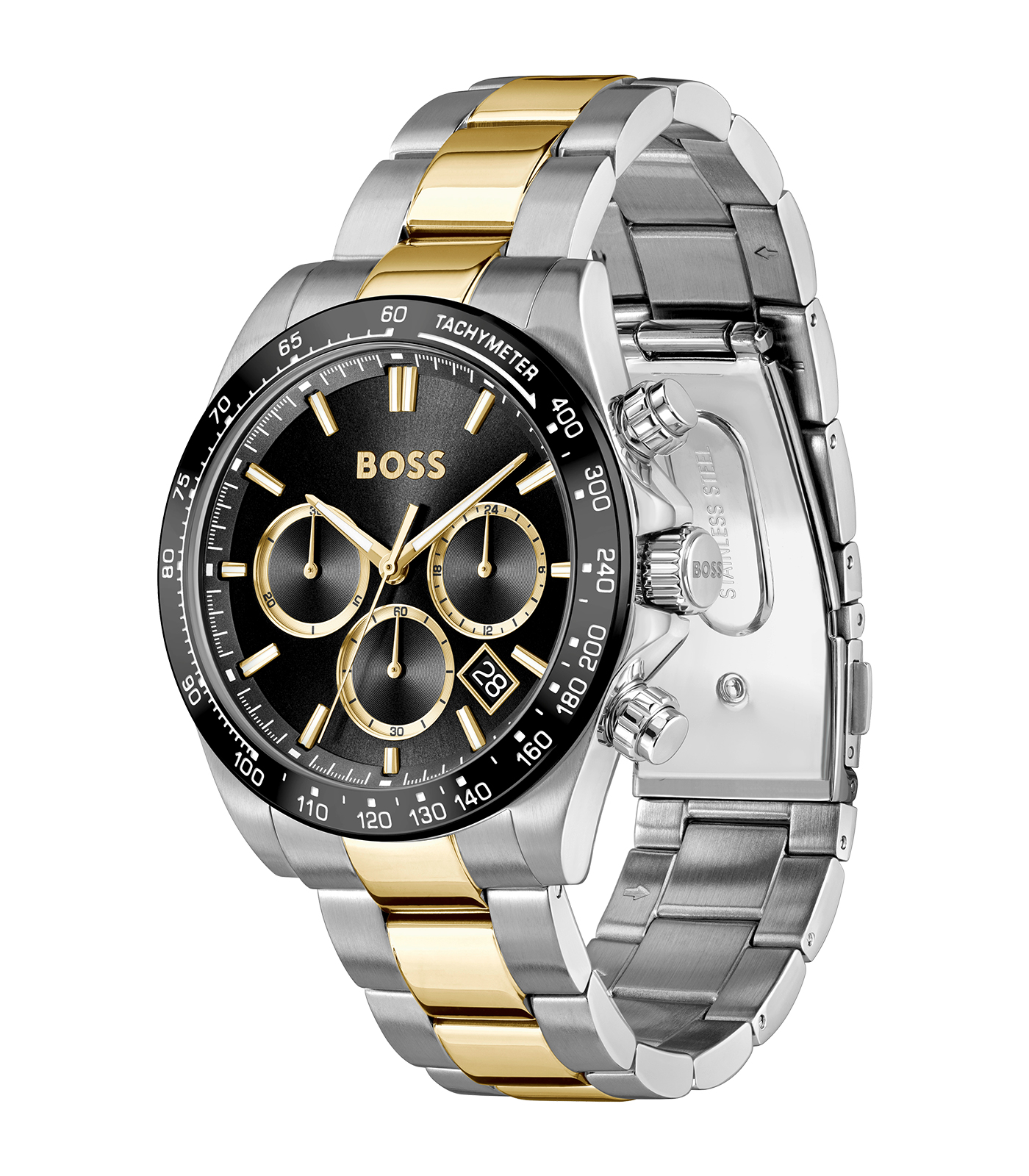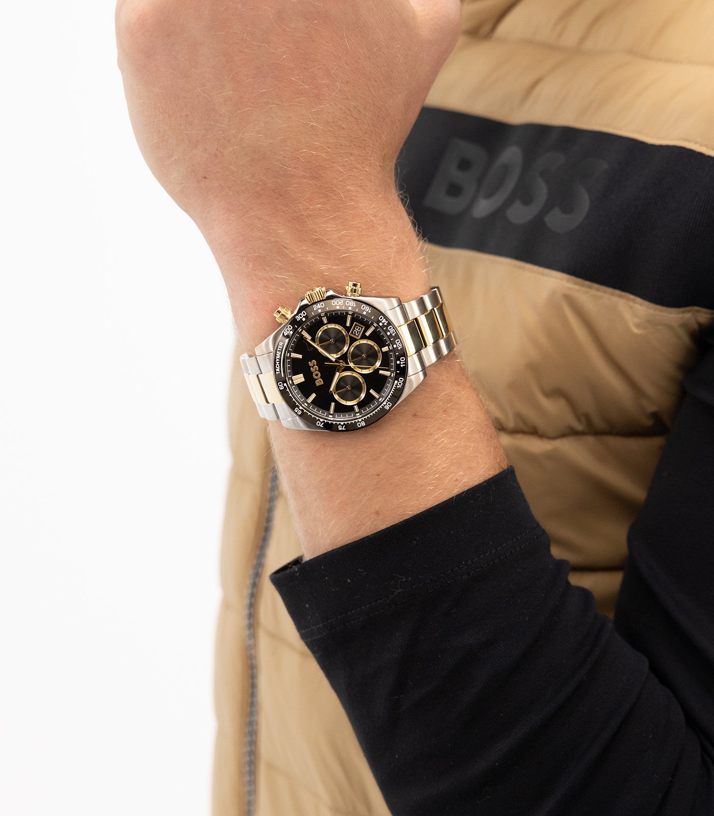 De Hugo Boss Bicolor Heren Chronograaf 1514269 is een stijlvolle polshorloge met een 43mm ronde kast van zilverkleurig roestvrij staal en een goud-zilverkleurige band. Uitgerust met een zwart wijzerplaat met streepindex, datumfunctie, quartz uurwerk en waterbestendig tot 5 ATM. Perfect te dragen bij zowel formele als casual gelegenheden voor een verfijnde uitstraling.