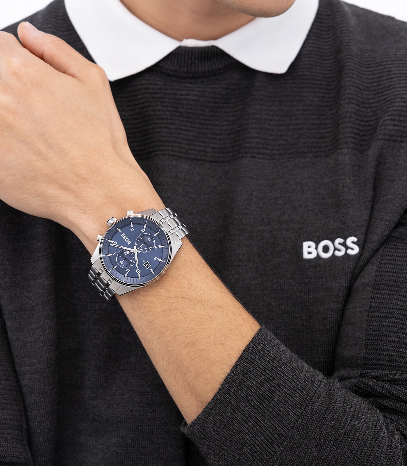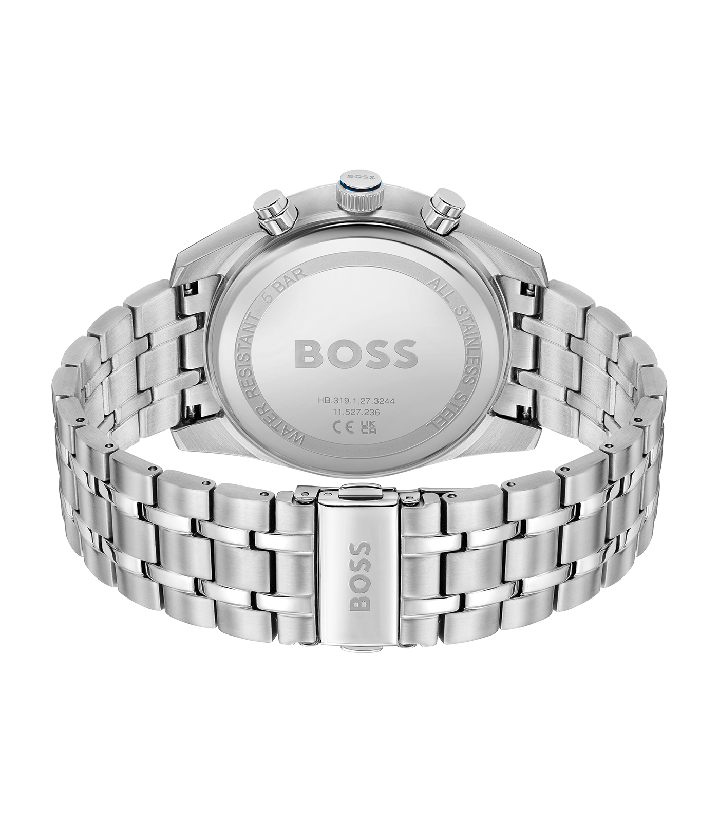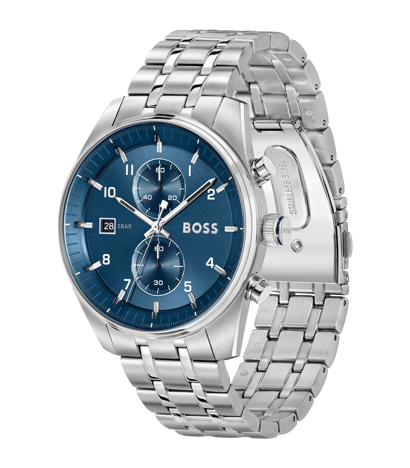 Hugo Boss Chronograaf Heren Horloge (model 1514216) heeft een 44mm roestvrijstalen kast en band in zilverkleur. Het heeft een blauwe wijzerplaat met Arabische index en chrono multi-indicatie. Voorzien van datumaanduiding en 5 ATM waterdicht. Draag het stijlvol bij formele of zakelijke outfits voor een verfijnde uitstraling.