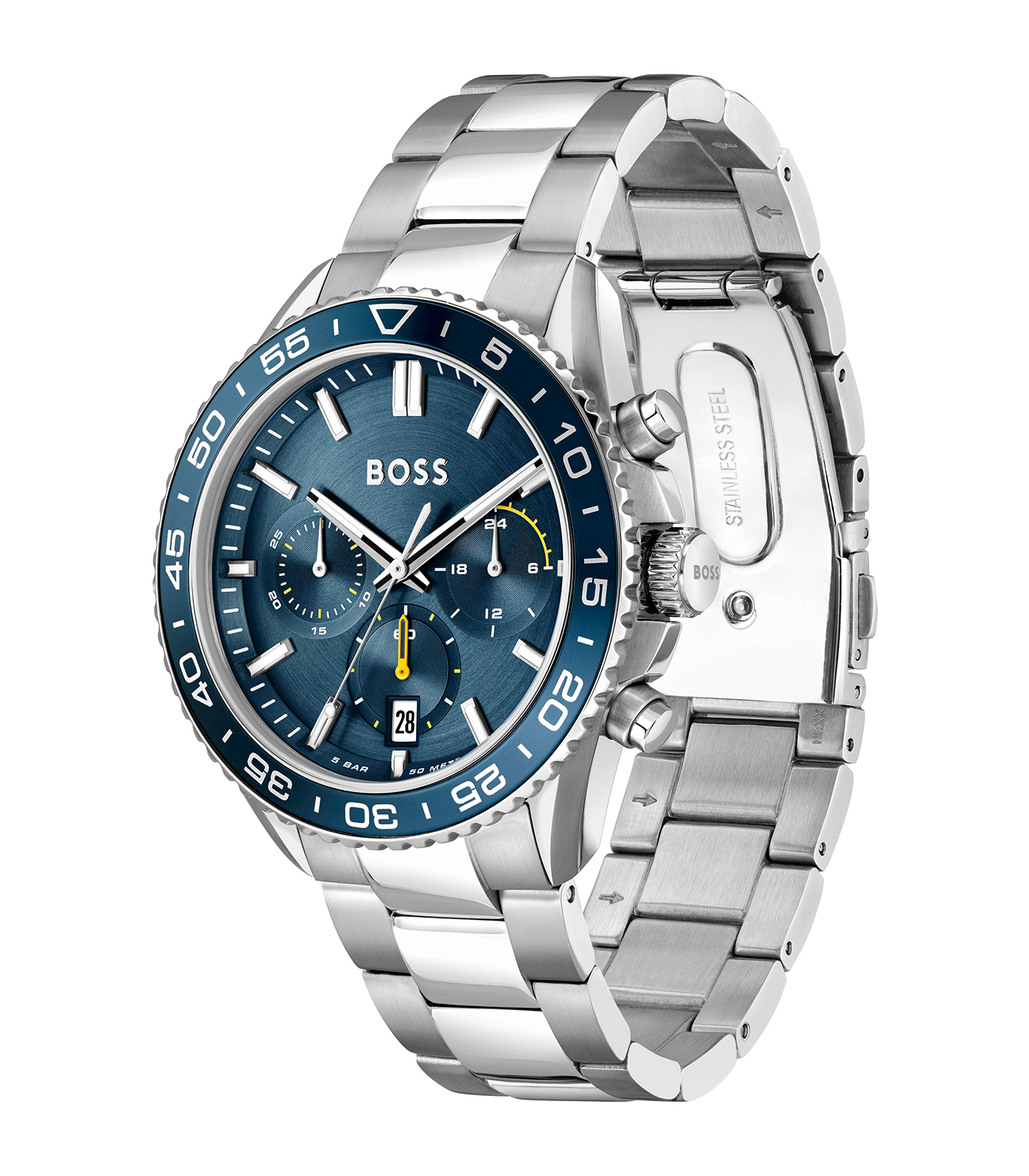 De Hugo Boss Heren Chronograaf 1514143 is een stijlvolle polshorloge met een quartz uurwerk en zilverkleurige roestvrijstalen kast en band. De blauwe wijzerplaat heeft streepindexen, en het horloge is waterbestendig tot 5 ATM. Ideaal voor zowel formele als casual gelegenheden, dankzij het elegante ontwerp.