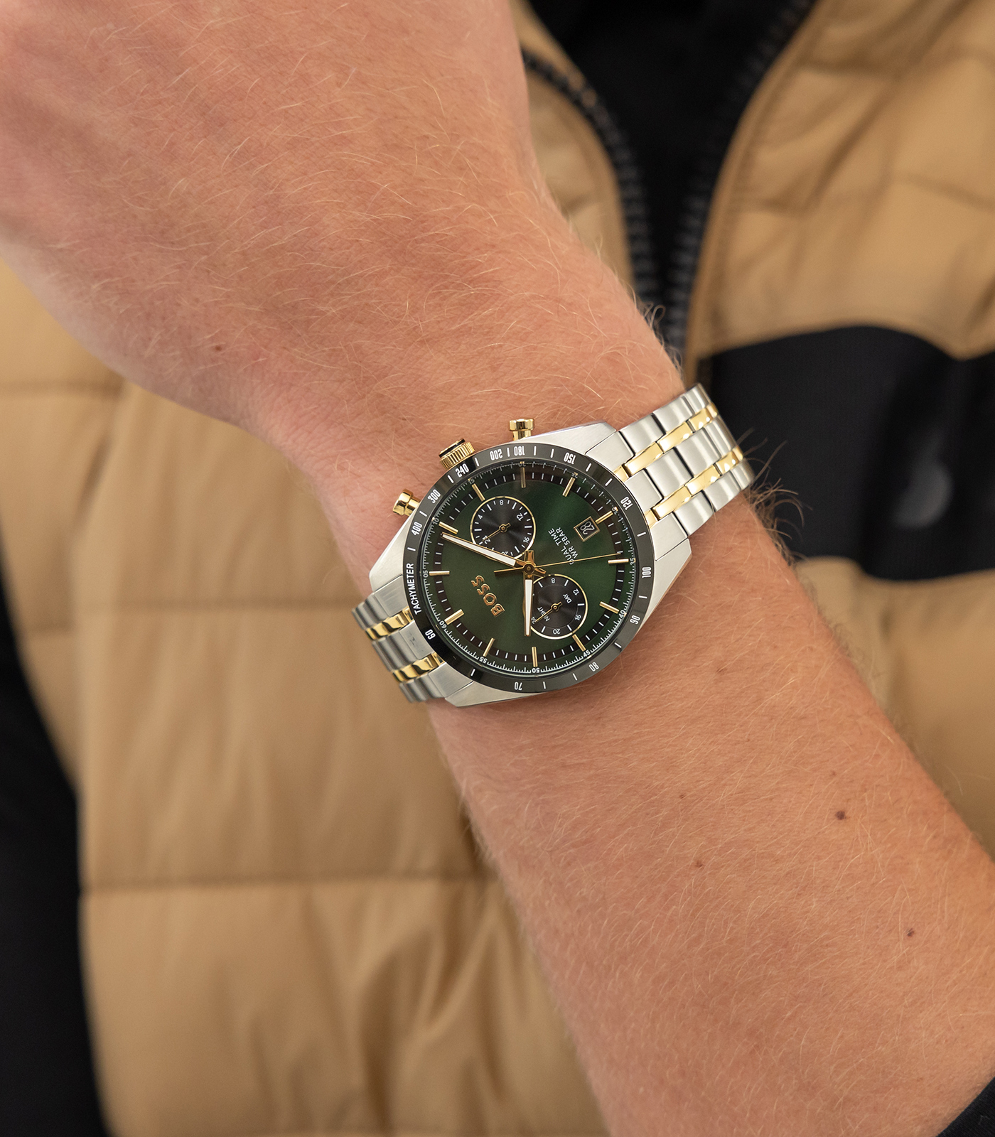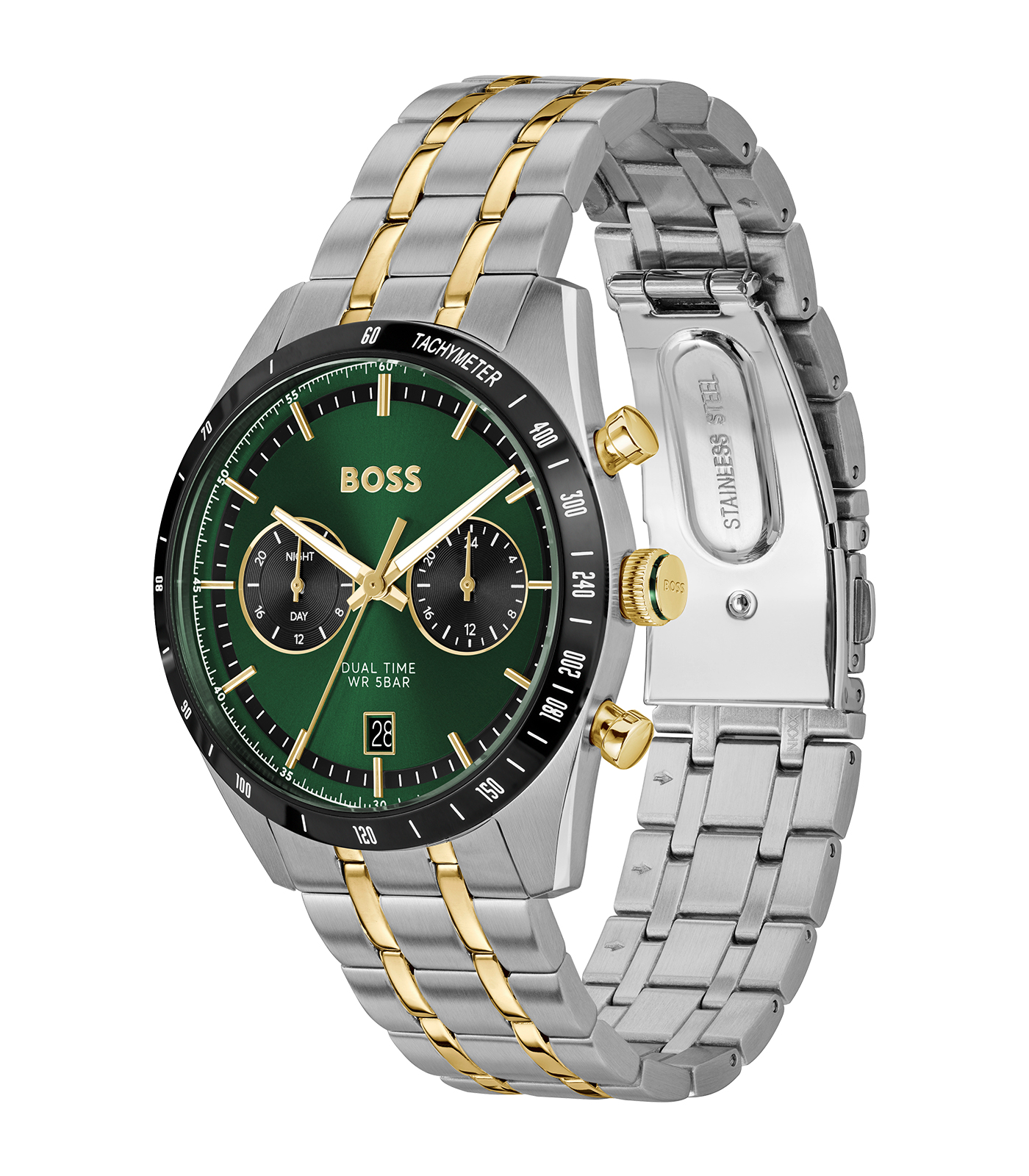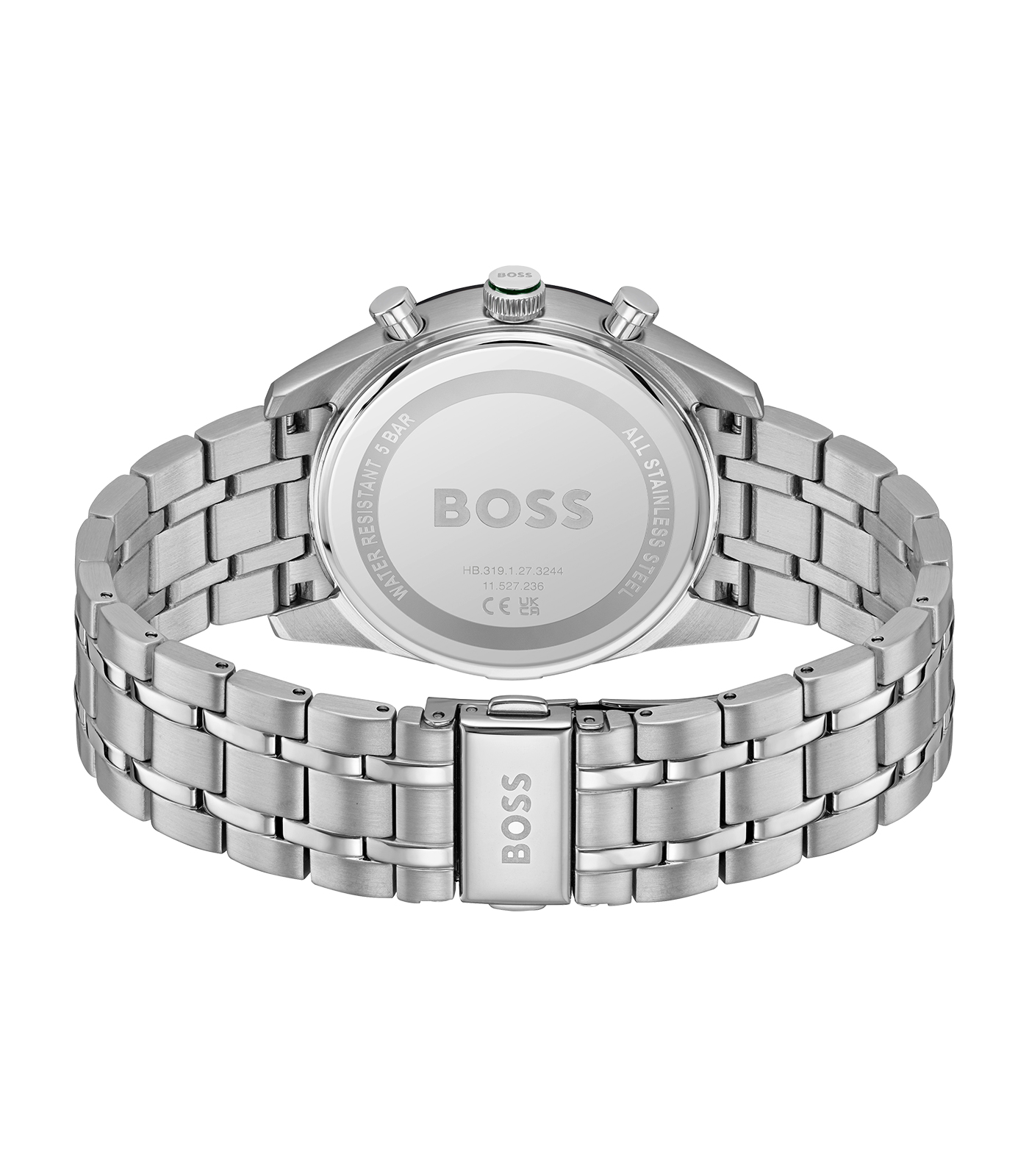 Hugo Boss Tourmaster is een stijlvol polshorloge met een groene analoge wijzerplaat en gestreepte index. Met een edelstalen kast en band, en een datumfunctie, biedt het een luxe uitstraling. Waterbestendig tot 5 ATM en nikkelvrij. Draag deze klassieke horloge bij formele of zakelijke gelegenheden voor een verfijnde look.