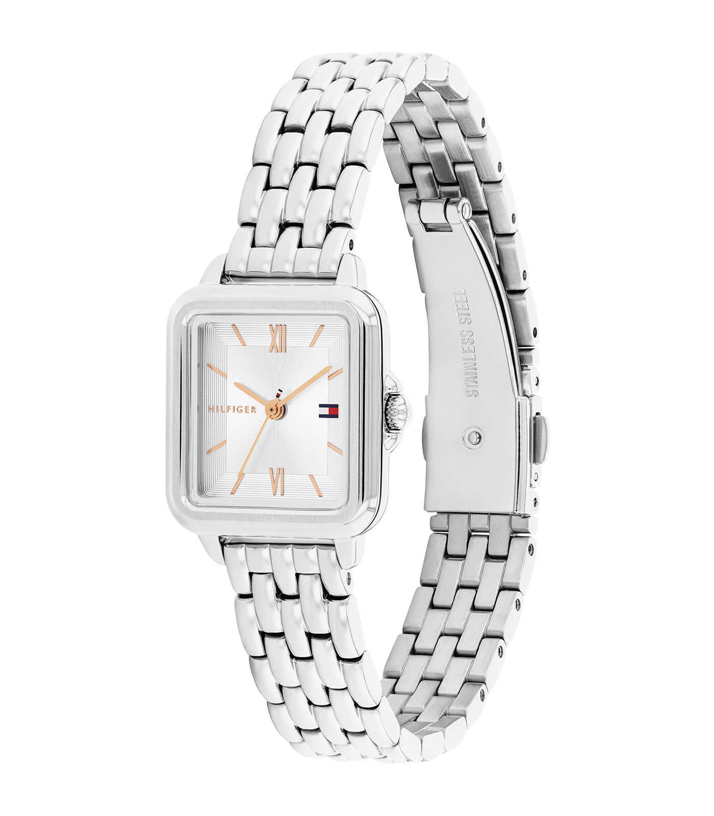 Tommy Hilfiger met een zilverkleurige, roestvrijstalen kast en band. De rechthoekige wijzerplaat is analoog met streepindexen. Het horloge heeft geen datum- of lichtfunctie en is waterbestendig tot niveau 3. Draag dit elegante quartz-horloge bij formele of casual gelegenheden voor een stijlvolle en moderne uitstraling.