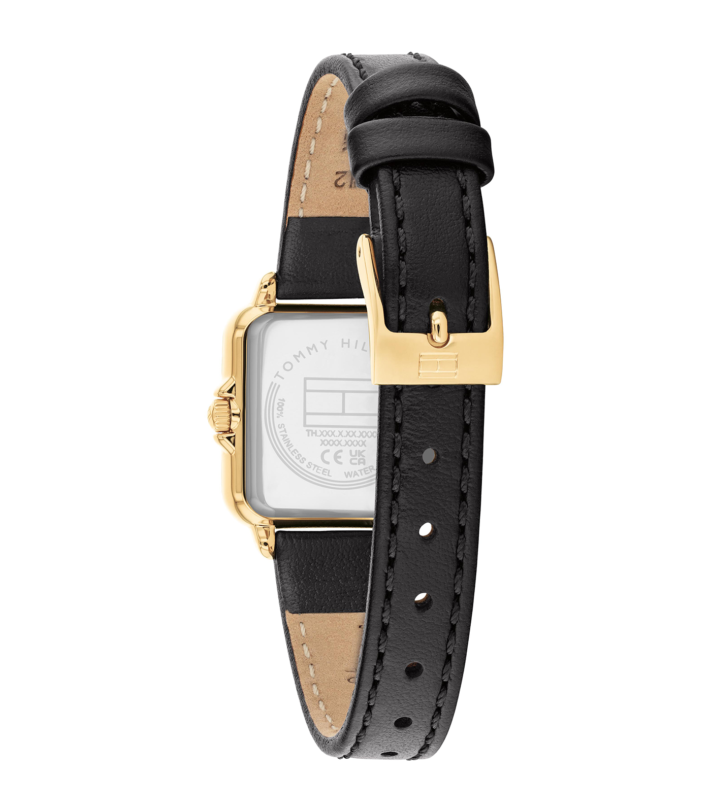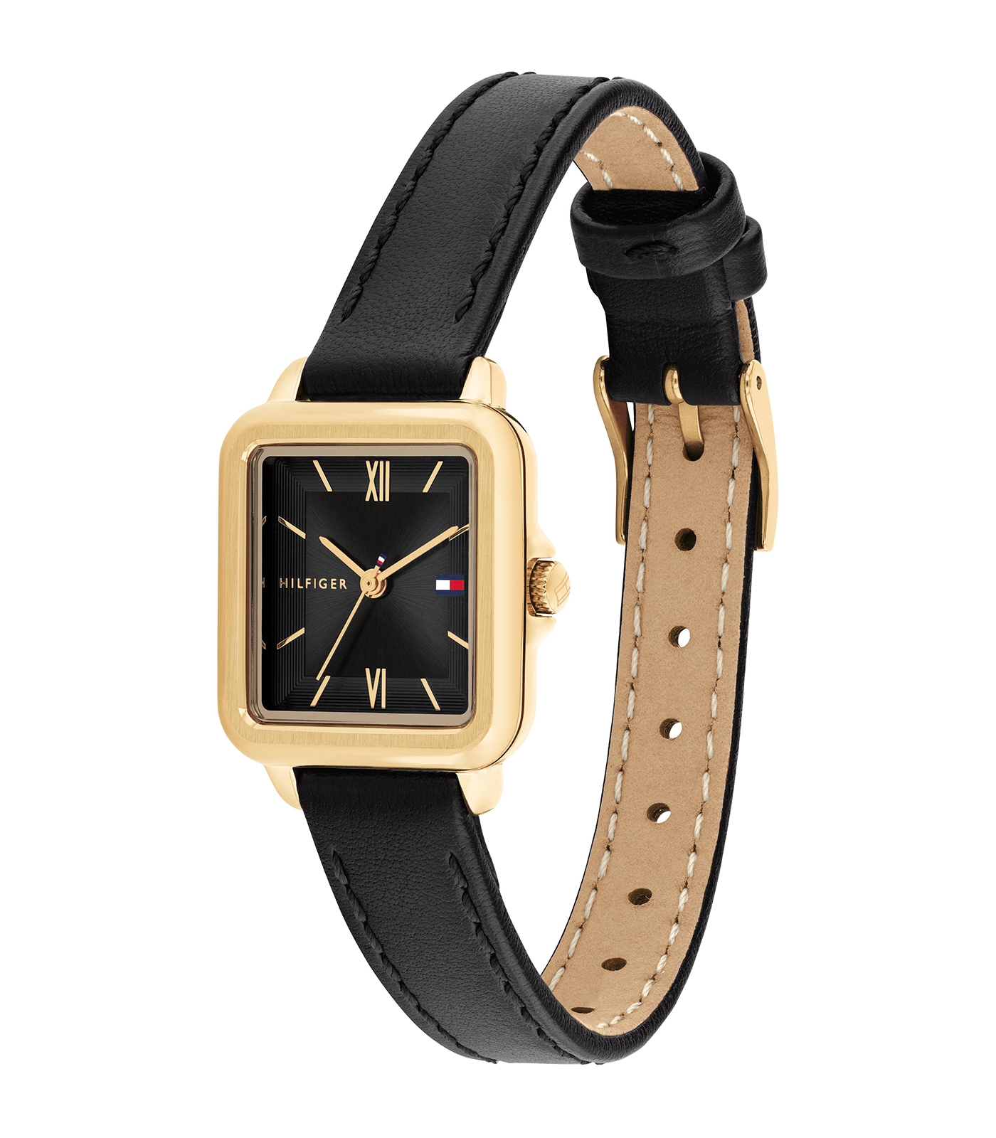 Het Tommy Hilfiger Dames Horloge 1782835 is een elegante toevoeging aan je collectie. Met een zwarte, lederen band en een rechthoekige roestvrijstalen, goudkleurige kast. De analoge wijzerplaat met Romeinse indexen maakt het horloge stijlvol. Waterbestendig tot 3 ATM, quartz uurwerk en nikkelvrij - ideaal voor dagelijks gebruik. Combineer het met casual en zakelijke outfits.