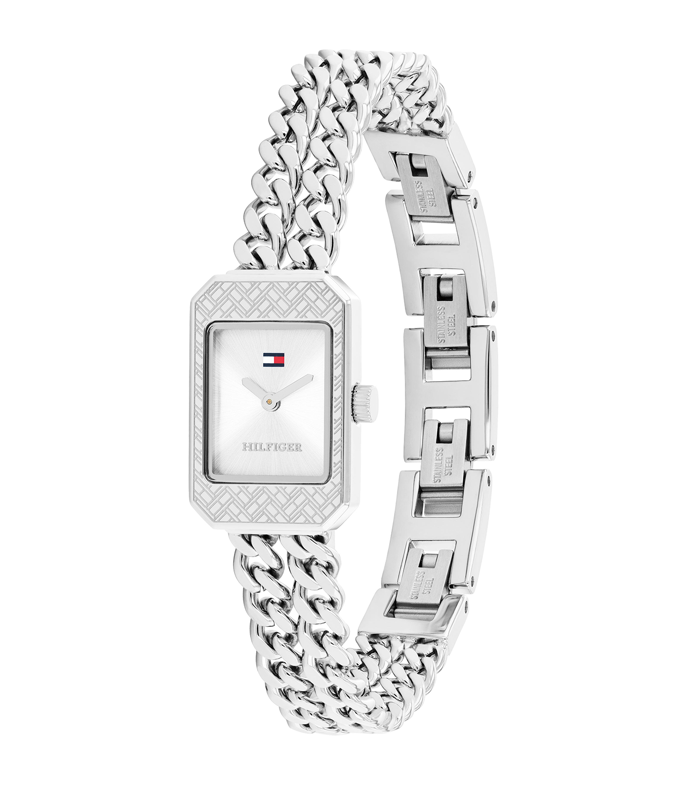 Het Tommy Hilfiger Dames Horloge model 1782841 is een elegante polshorloge met een rechthoekige kastvorm in zilverkleurig roestvrij staal. Het heeft een analoge wijzerplaat zonder datumfunctie, en een quartz uurwerk. Waterbestendig tot niveau 3. Perfect voor dagelijks gebruik of zakelijke ontmoetingen, dit horloge combineert moeiteloos stijl met functionaliteit.