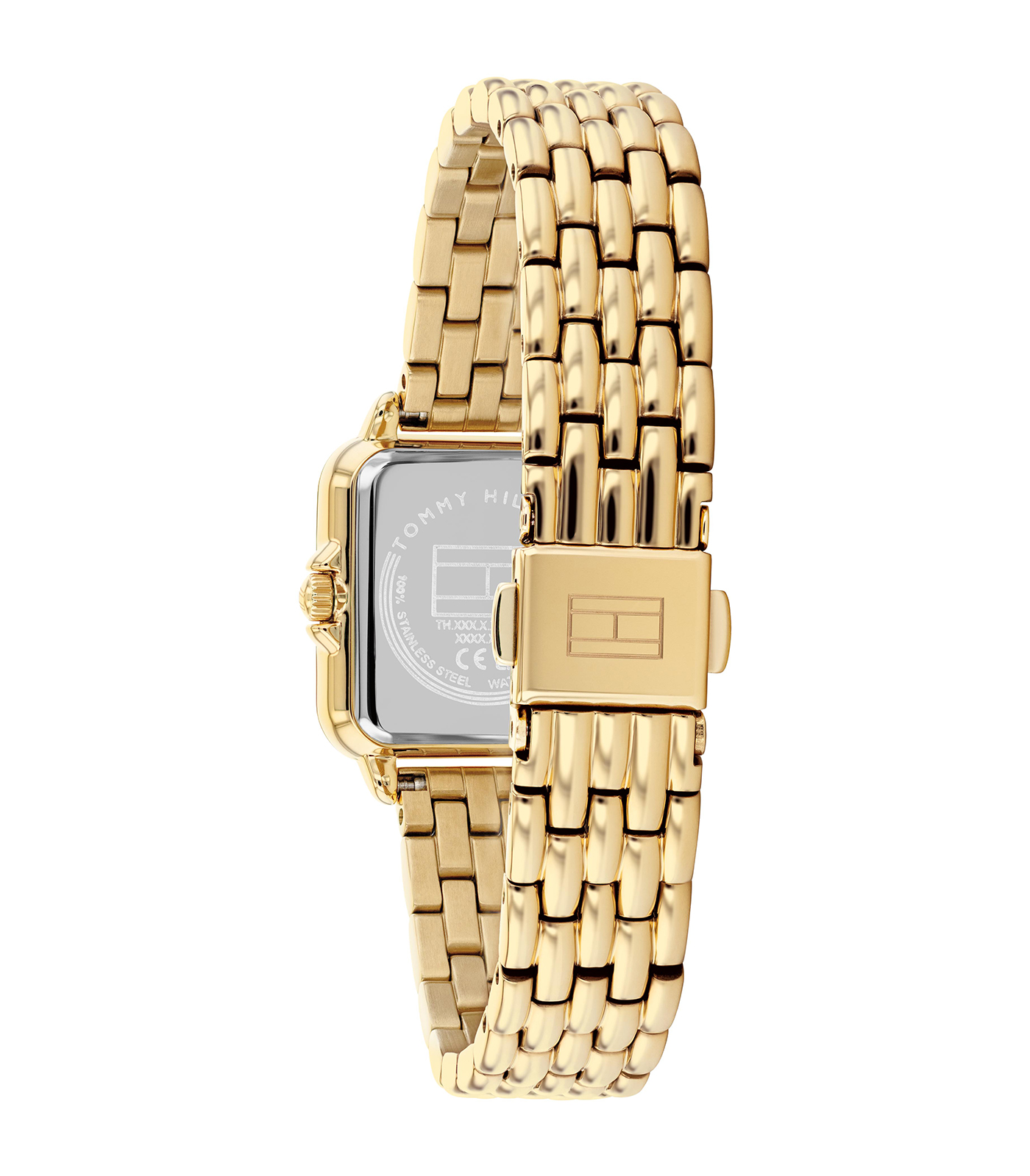 Het Tommy Hilfiger Dameshorloge model 1782858 heeft een elegante rechthoekige kast van roestvrij staal in goudkleur, met een groene wijzerplaat en Romeinse cijfers. Dit analoge horloge heeft een quartz uurwerk en is waterbestendig tot niveau 3. Perfect voor een verfijnde look bij elke gelegenheid, dankzij de stijlvolle roestvrijstalen gouden band. Draag het met zelfvertrouwen!