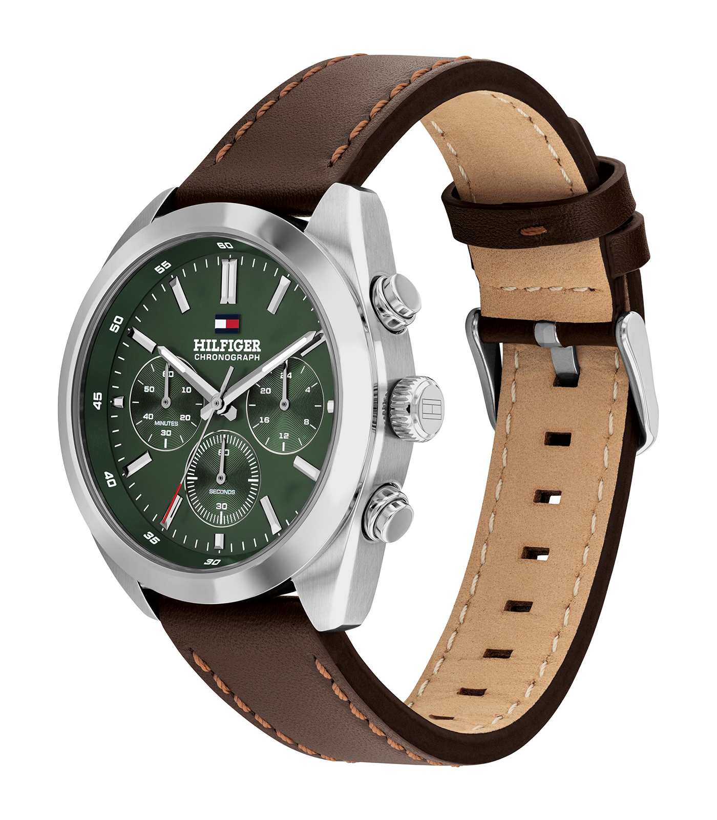 De Tommy Hilfiger Heren Chronograaf 1710719 is een stijlvolle polshorloge met een roestvrijstalen zilverkleurige kast en een bruin leren bandje. De groene wijzerplaat voegt een vleugje verfijning toe aan je look. Dit horloge, uitgerust met een quartz uurwerk en chronograaf-functie, is perfect voor zowel formele als casual gelegenheden. Draag het met een nette blouse of een casual trui voor een moderne uitstraling. Waterbestendig tot 5 ATM.
